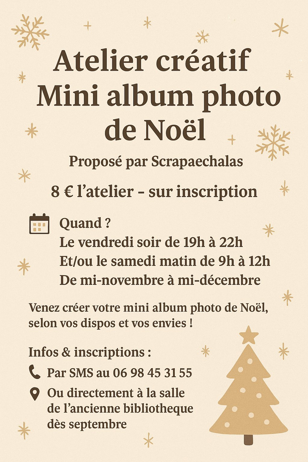 L’association Scrapaechalas organise des ateliers créatifs mini album photo de Noël pour enfants et adultes de mi-novembre à mi-décembre dans la salle de l’ancienne bibliothèque :