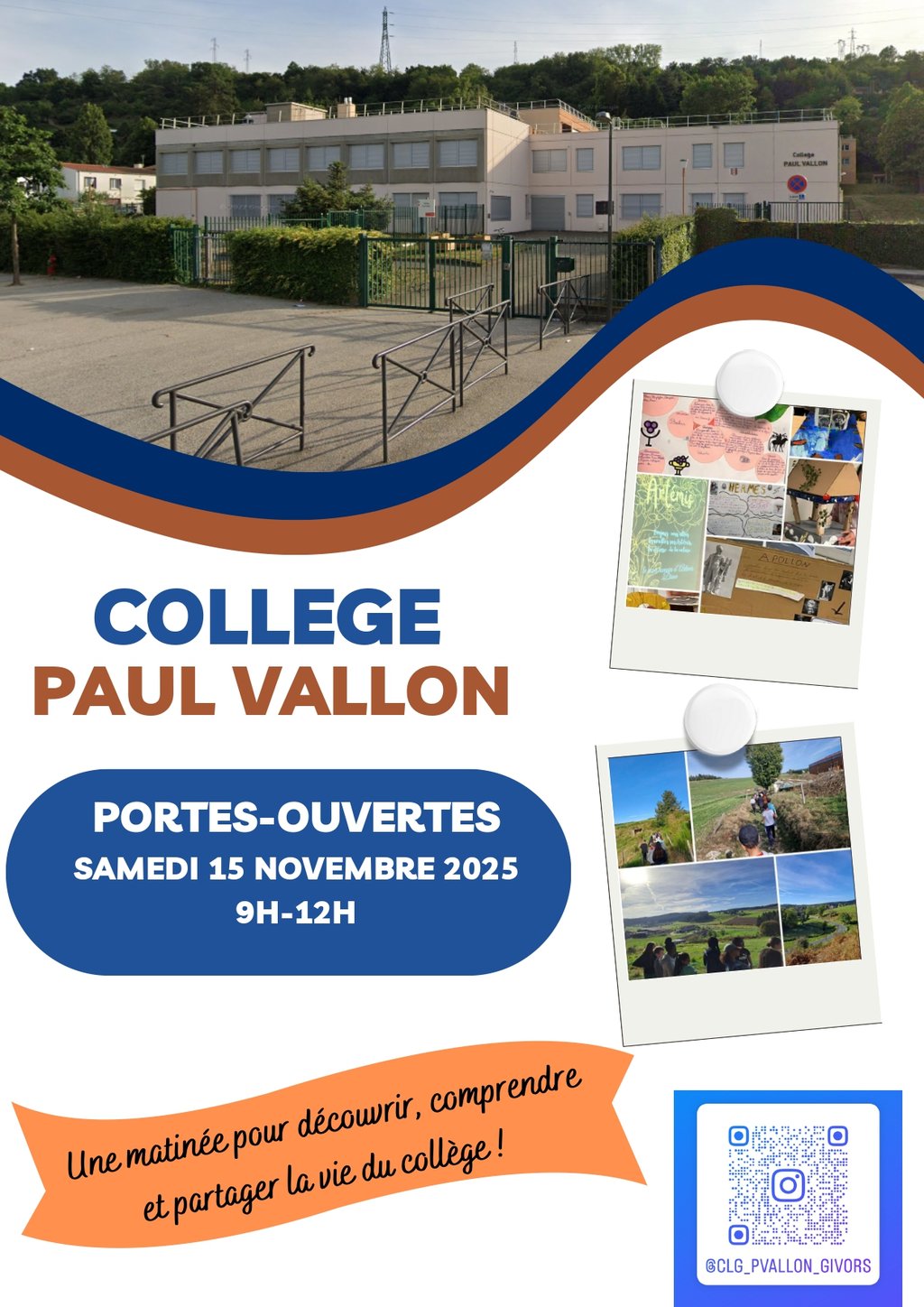 Matinée Portes Ouvertes du collège Paul Vallon le samedi 15 novembre 2025, de 9h à 12h.