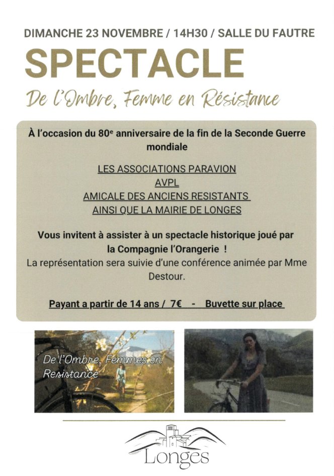 À l’occasion du 80ᵉ anniversaire de la fin de la Seconde Guerre mondiale, les associations Paravion, AVPL, l’Amicale des Anciens Résistants et la Mairie de Longes vous invitent à assister au spectacle historique :