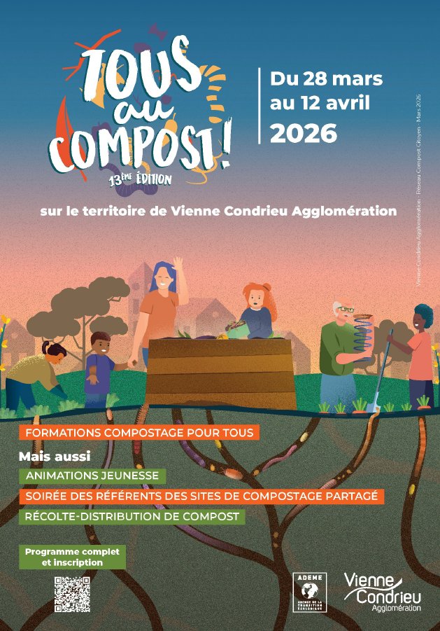 Dans le cadre de la quinzaine nationale du compostage de proximité, du 28 mars au 12 avril 2026, Vienne Condrieu Agglomération organise sur son territoire plusieurs actions de sensibilisation pour permettre à un large public de mieux comprendre comment composter, mais aussi de mieux appréhender les enjeux du compostage.