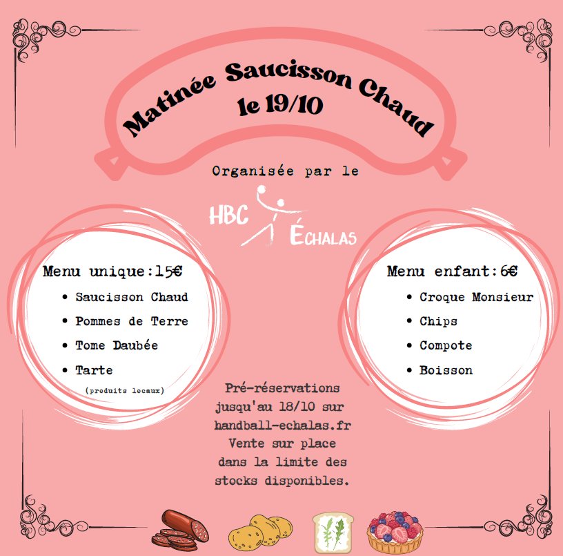 Le Handball Club Échalas organisera sa traditionnelle matinée Saucisson Chaud le dimanche 19 octobre 2025 à partir de 11h.