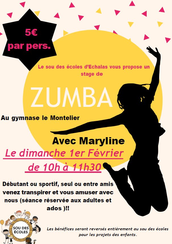 Le sou des écoles d’Échalas vous propose un stage de Zumba au gymnase le Montelier, le dimanche 1er février de 10h à 11h30.