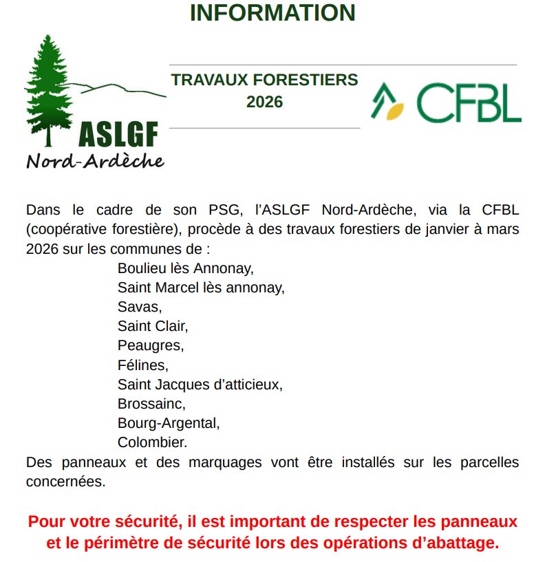 Dans le cadre de son PSG, l’ASLGF Nord-Ardèche, via la CFBL (coopérative forestière), procède à des travaux forestiers de janvier à mars 2026 sur les communes de :